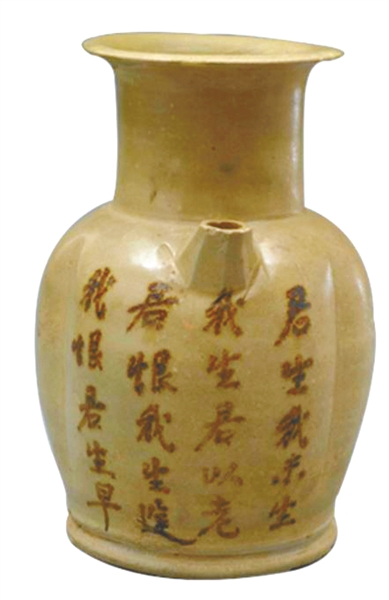 长沙窑窑址出土青釉“君生我未生”瓷壶 长沙博物馆藏