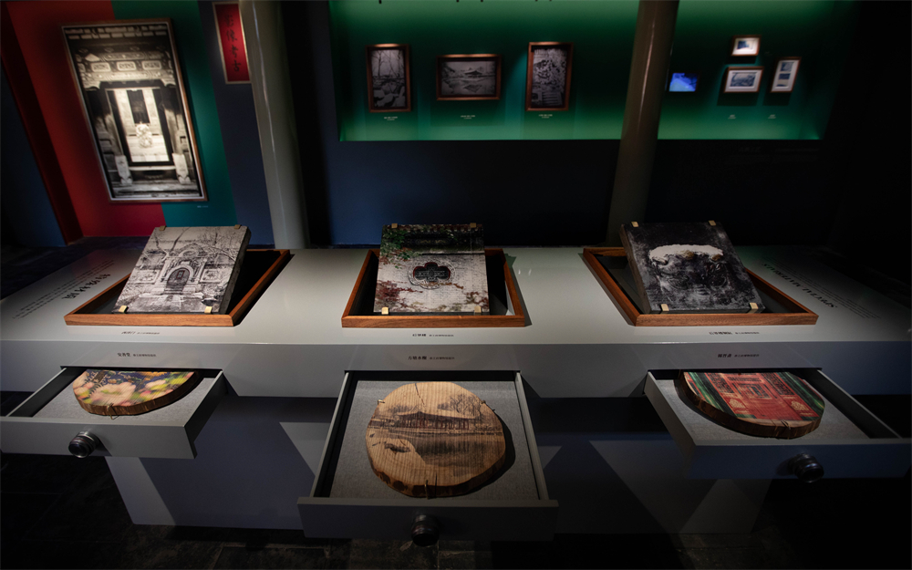 第二篇章“白驹过隙·影像考古”将视角延伸至影像本身,将其视为探究建筑生命史的考古媒介,通过“古今对照”“古典工艺”与“特殊材质”三大板块,揭示古建空间在数百年历史中的“变与不变”。“古今对照”通过新旧影像的并置,展现建筑在时光中留下的被“干预”与“修复”痕迹,并借助技术手段实现从胶片到数码的色彩与质感过渡,构建“双时态”的观看体验,引发对文化遗产保护深刻认知的同时,也反思影像技术本身作为历史证据的演变过程。“古典工艺”运用蓝晒、湿版等特殊技法,以图像的斑驳质感呼应建筑在时间中的嬗变。“特殊材质”将影像转印于方砖、木等古建筑修缮材料上,以或冰凉、或坚实、或粗糙的物理质感,描摹蕴含着不同故事与记忆的建筑影像,形成古建筑可触摸的“视觉档案”。